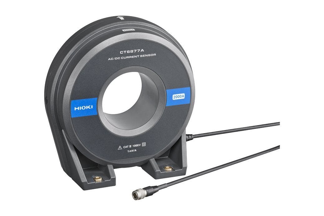 The CT6877A has a frequency bandwidth of DC to 1 MHz and a rated current of 2000 A. In combination with the Power Analyzer PW8001, high frequency and low power factor power can be accurately measured. The PW8001 automatically acquires and corrects the phase of the current sensor with 0.001°resolution, bringing out the best performance of the current sensor without any effort.
