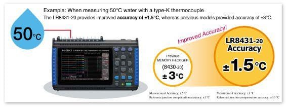 Example: When measuring 50°C water with a type-K thermocouple, The LR8431-20 provides improved accuracy of ±1.5°C, whereas previous models provided accuracy of ±3°C.