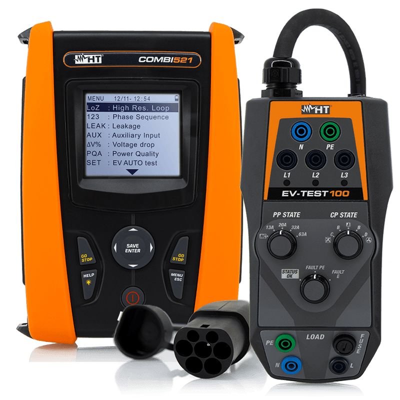 The Combi521EV from HT Instruments is a multifunction electrical installation and EVSE safety tester with power quality analysis. This Combi521EV features an auto-sequence test function which allows the user to set values for testing parameters with the device indicating compliance or non-compliance with these standards. Being a combined verification instrument, COMBI521EV also carries out tests on electric systems in compliance with IEC/EN 61557-1 and measurements of continuity of the protection cable, insulation resistance (with calculation of PI and DAR), overall earth resistance, RCDs type B, A and AC tripping time and current, line / fault impedance with calculation of prospective short circuit / fault current, phase sequence and conformity. The COMBI521EV also allows for the measuring and saving of environmental parameters (illuminance, temperature), leakage current and electric quantities such as voltage, current, power factor, power and harmonics on single-phase systems.