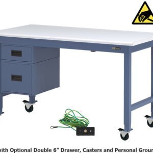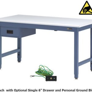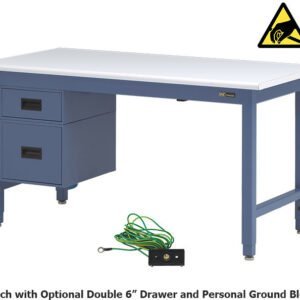 The worksurface is laminated over industrial-grade particle board to a full 1-1/4” thickness; metal threaded inserts are installed in a sealed underside for easy installation and long term strength and durability. Includes with this product is assembly hardware to be used with the pre-installed threaded inserts for easy assembly and high-strength connections. Each workbench has available options for ESD and includes dual ground studs and a 10-ft. ground cord. Topping this all off with an ergonomic 180 degree rolled front edge – standard on all IAC workbenches and workstations. Each ESD Worksurface is tested and results are logged at the factory/IAC Industries.