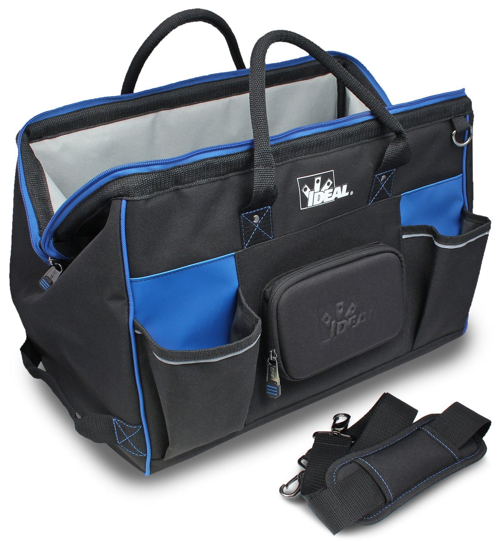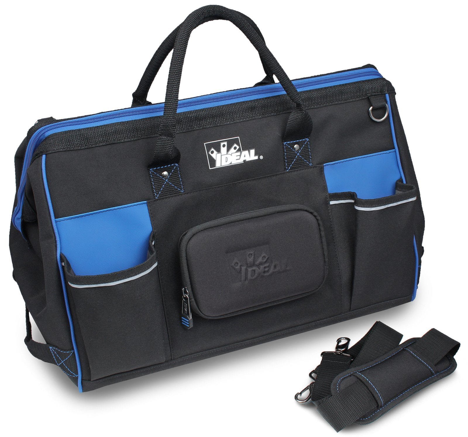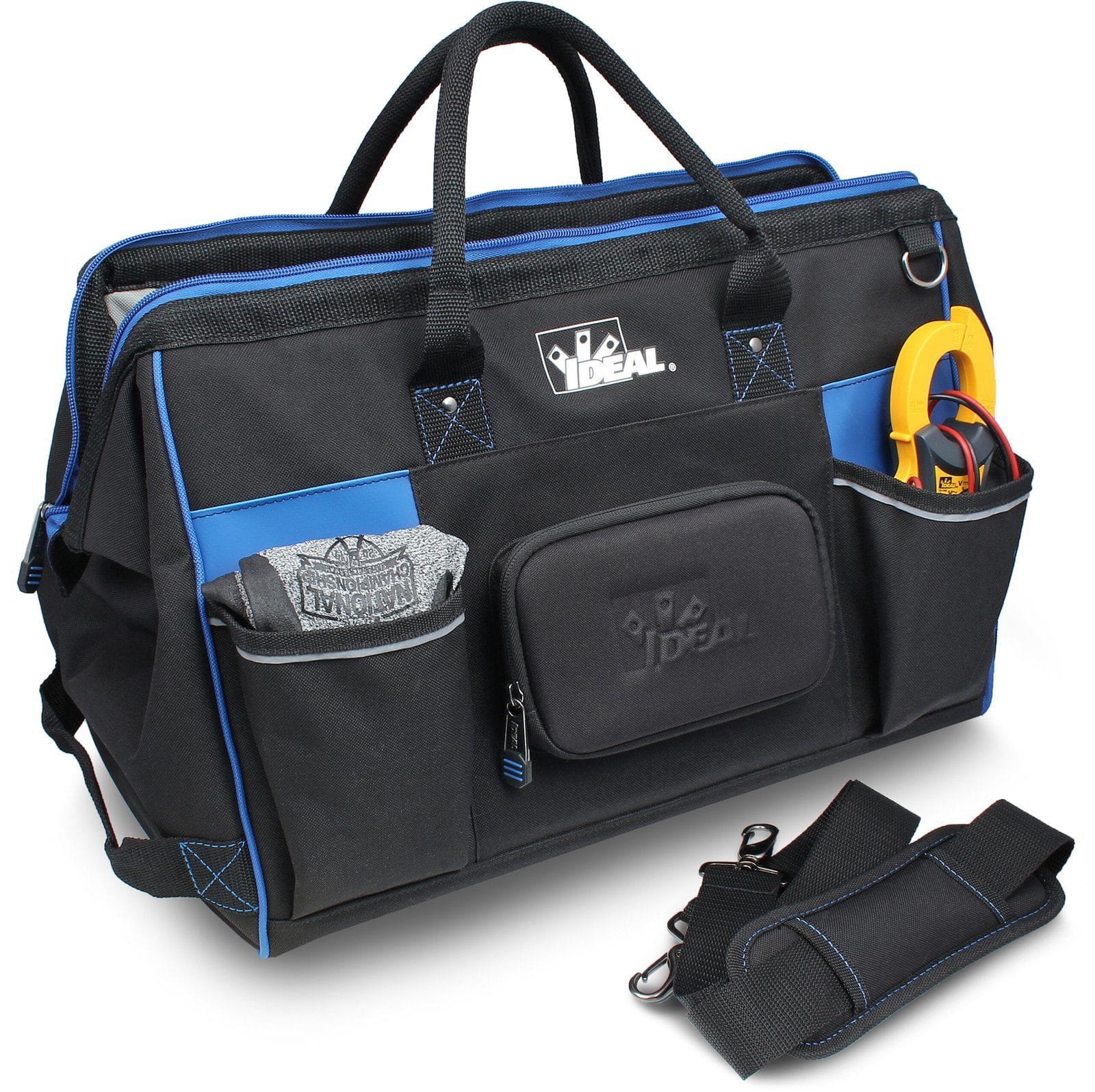 The IDEAL® Pro Series Large Mouth Bags feature a sturdy design that opens completely for ease of access to tools and equipment. Multiple interior and exterior pockets including a protective phone/sunglasses case allow you to store and carry what you need for every job.