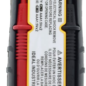 The back of the meter has a built-in two position dual probe holder; the lower position allows for probe storage, the higher position allows for testing or measurement holding the meter and secured probe in one hand and the second probe in the other hand, or for both probes to be secured in the tip while conducting measurements. The meter has a hanging strap mount (compatible with all other IDEAL meters with this feature) that allows for a hanging strap (sold separately) to be attached to the meter so it can be hung from a nail, screw or magnetic surface. This meter features HOLD, MIN/MAX, Relative, Range, and selectable Auto Power Off functions. The meter comes with 3 1.5V AAA Batteries and an easy open, fully accessible storage pouch with a belt loop that allows for storage.