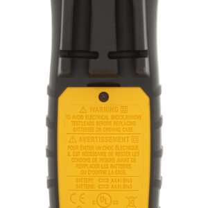 The back of the meter has built-in two position dual probe holder; the lower position allows for probe storage, the higher position allows for and testing or measurement holding the meter and secured probe in one hand and the probe in the other hand, or for both probes to be secured in the tip while conducting outlet testing. The meter has a hanging strap mount (compatible with all other IDEAL meters with this feature) that allows for a hanging strap (sold separately) to be attached to the meter so it can be hung from a nail, screw or magnetic surface. A Pro industrial grade over molding design makes this tester easy to grip and capable of sustaining a drop from 6.5 ft (2 m). This meter features a Self-Test at each Power ON, Automatic AC/DC voltage and DC polarity detection, a low battery indication, an Auto Power Off function and comes with 3 1.5V AAA Batteries.