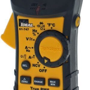 The IDEAL 61-747 TightSight™ Clamp Meter is a CAT III 600 V rated auto ranging true root mean square (TRMS) digital clamp meter that measures up to 400 Amps AC and DC current via the clamp head. It measures up to 600V AC and DC, frequency, resistance, continuity, capacitance, and diodes via test-leads (included) and measures temperature (⁰F/⁰C) via a K-Type thermocouple (included). It’s capable of detecting the presence of voltage between 40V to 600V via a non-contact sensor in the right tip of the clamp. The patented TightSight LCD Display, located on the bottom of the unit, enhances safety and productivity by displaying a secondary reading at the end of the meter, eliminating the need to bend or twist conductors or place you head near the panel in order to see the main meter display. Both displays can be backlit, and a built-in flashlight can be illuminated when working in poor or zero lighting conditions. The unit uses an illuminated red LED in the center of the meter and emits audible tones to notify when voltage is above 30 volts, when continuity is detected and when the NCV senses voltage within its set range.