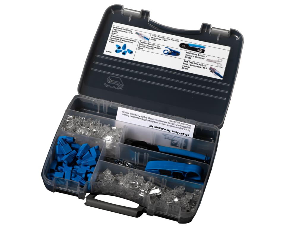 - Feed-thru starter kit provides Ideal’s recommended tools and plugs to cut, strip, and terminate feed-thru modular plugs onto twisted pair cables