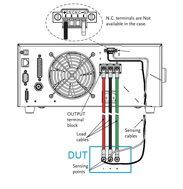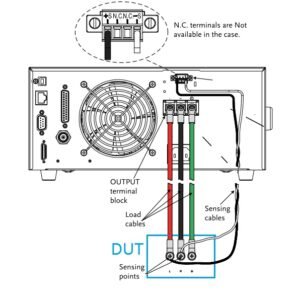 For high current output applications, the voltage drop caused by large current passing through the load cables will affect the measurement results. The ASR-2000 series provides the remote sense function that can sense the voltage drop of the DUT to the ASR-2000 series and the DUT will be compensated by the ASR-2000 series. The maximum voltage that the remote sense function can compensate is 5% of the output voltage.
