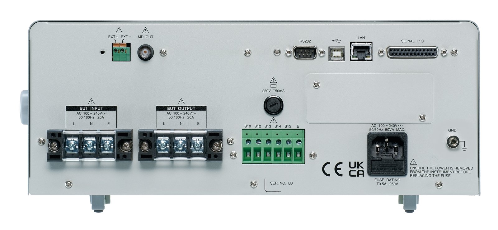 For the rear panel configuration, the GLC-10000 provides a reserved MD external terminal block (EXT+/EXT-), and users can self-define the required simulated impedance networks (only applicable to parallel RC combination) to measure the leakage current to meet the requirements of new MD in future regulations. The GLC-10000 provides a variety of standard interfaces, such as RS-232C, USB device, LAN and Remote I/O, and even GPIB (optional) to meet the needs of system control and data acquisition.