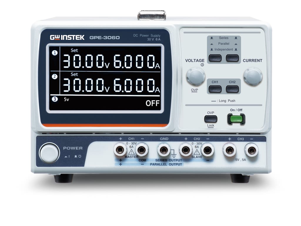 - GPE-3060 provides CH1/CH2: 0 – 30V / 0 – 6A output; CH3 supports 5.0V at 5A