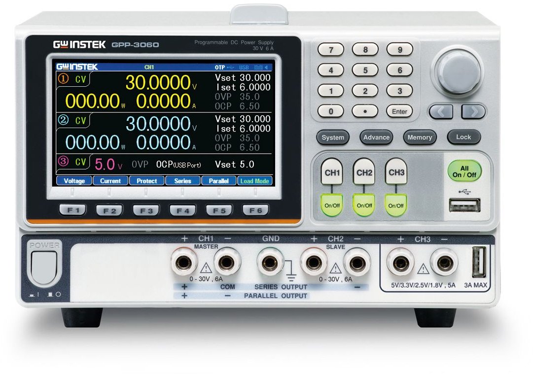 GPP-3060 and GPP-6030 three-channel programmable DC power supplies are extension models of the GPP-X323 series. The maximum output power of these two models is 385W. GPP-3060 supports CH1/CH2: 0 ~ 30V / 0 ~ 6A output; GPP-6030 supports CH1/CH2: 0 ~ 60V / 0 ~ 3A output; CH3 of both models supports 1.8V, 2.5V, 3.3V, 5.0V/5A.