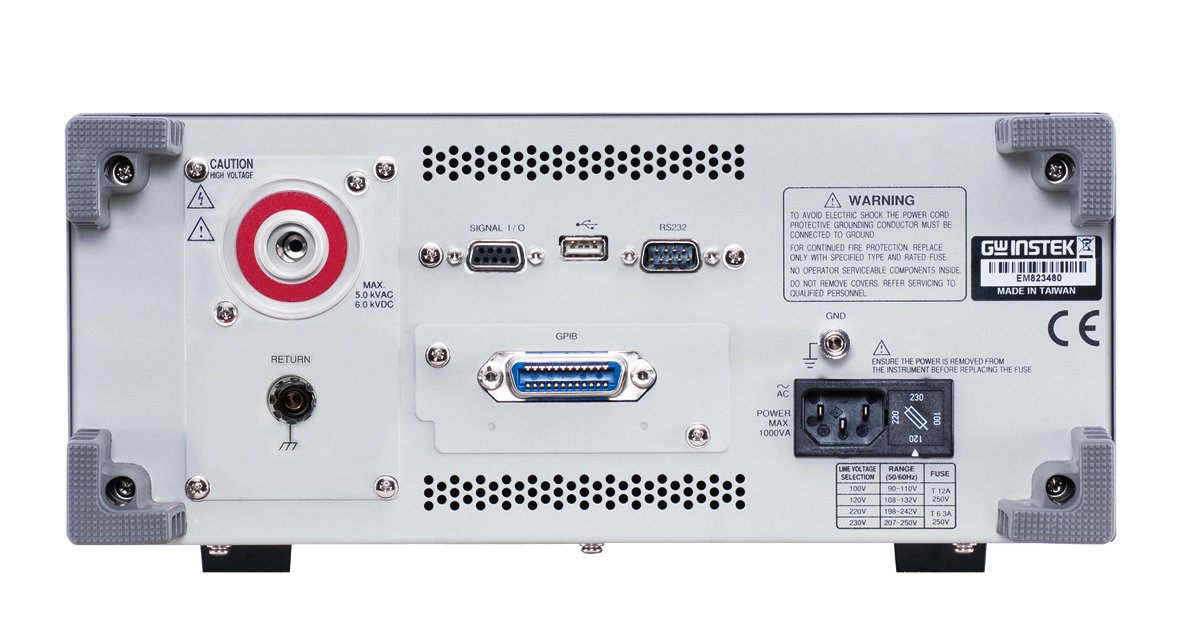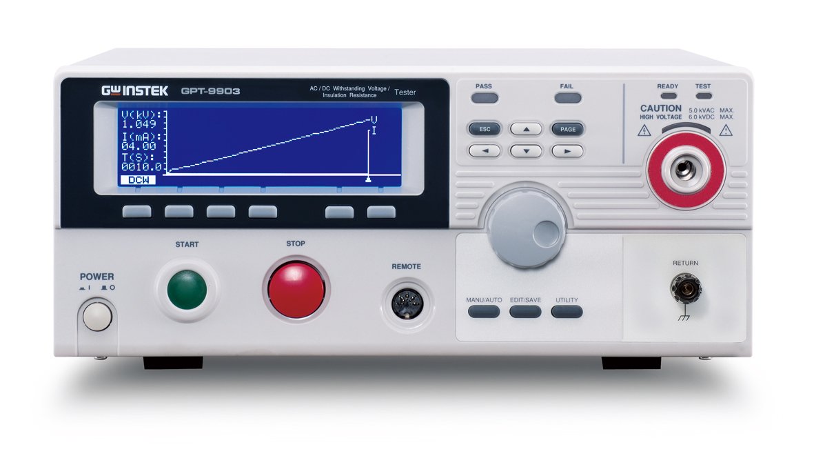 Following a tidy and easy-to-use design concept, the GPT-9900 series is equipped with a simple & clear panel layout, a high resolution dot matrix LCD display, and color LED indicators, allowing operators to interpret measurement results easily and quickly. In the role as the complement of 200VA safety testers, the GPT-9900 series is designed upon a 500VA output platform to enhance all major test functions, including AC withstanding (AC 5kV/100mA), DC withstanding (DC 6kV/20mA), insulation resistance (DC 50V ~ 1000V/50GΩ max.) and ground bond (AC 32A max./650mΩ max.) tests, with high-power measurement capabilities.