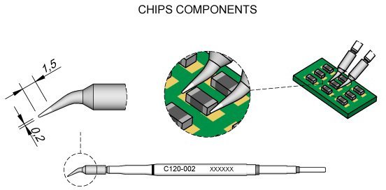 C120 cartridges are appropriate for soldering and desoldering chip components or dual in-line easily, reducing handling time. The C120 series are compatible with PA120 and AM120 tweezers. Tips are sold individually, not in pairs.