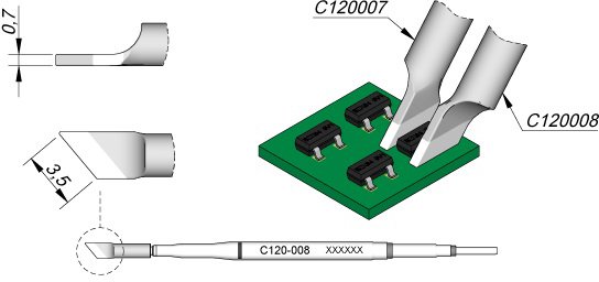 C120 cartridges are appropriate for soldering and desoldering chip components or dual in line easily, reducing handling time. The C120 series are compatible with PA120 and AM120 tweezers. Tips are sold individually, not in pairs.