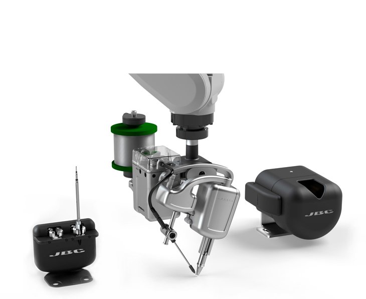 The JBC soldering kits for robot are available general soldering and for intensive heavy duty soldering. The complete kit consists of the following components which can be purchased separately or as a kit (soldering iron, control box, solder feeder, tip cleaner, cartridge stand).