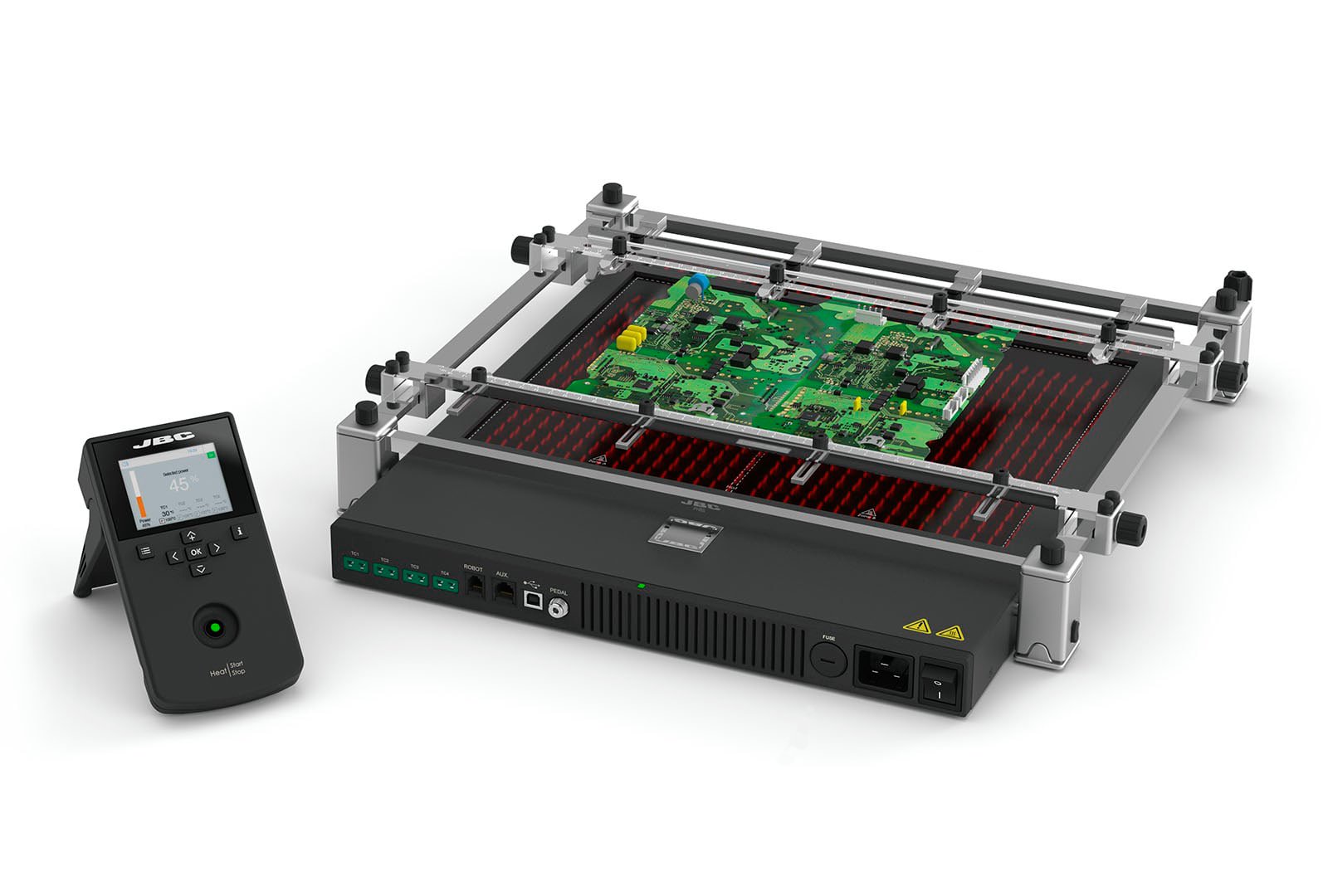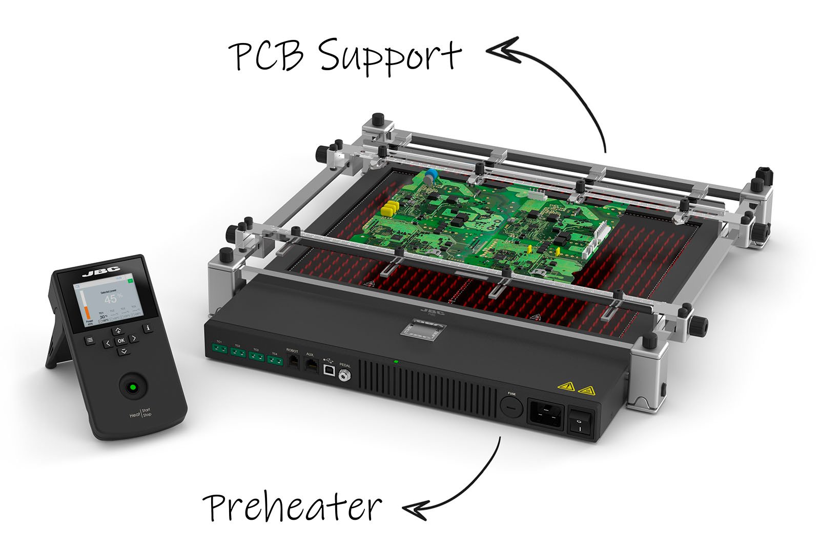 The JBC PHBEK is a package with PHBE preheater and PHB-SA PCB support. Designed to rework medium / large PCBAs, it features two zone control with a total heating area of 14.2 x 10.9” as well as four thermocouple connections. The PHBE offers matchless reliability in temperature accuracy and control of the PCBA so that no component is damaged.