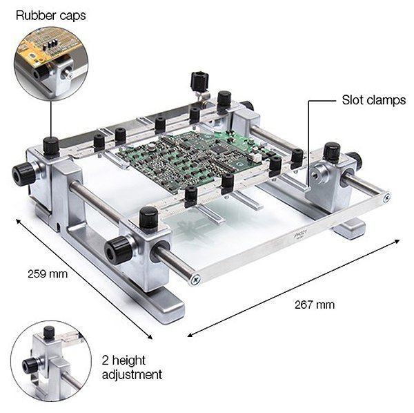 This support is perfectly adapted to any type of PCB by means of its many adjustable parts.