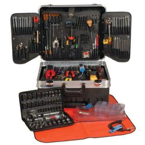 Jensen Tools’ Master Electronic Tool Kits is in a black case with silver valance and features a comprehensive selection of 191 tools to accomplish almost any job you come across in the field. Includes the Inch/Metric kit all the tools you need, in both inch and metric varieties. The Master kit includes wheeled case with telescoping handle for excellent maneuverability, plus: rubber with ball bearing wheels; padded steel core handle; plated steel knob protectors; and a wide wheel base for stability.