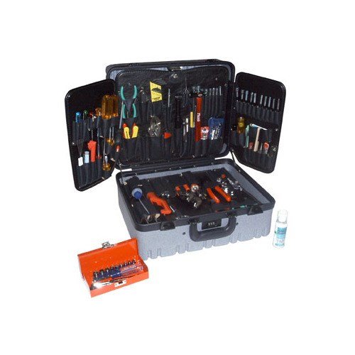 Over 130 of the most commonly used tools in the electronic service industry. 10 Screwdrivers, 9 cutters & pliers, retaining ring pliers, SAE/ Metric 1/4″ socket set, and many more items from X-celite, Ullman Devices, and Bondhus. The case is rotationally molded with a padded handle and drawbolt-style latches. This case is gray in color and does not have wheels.