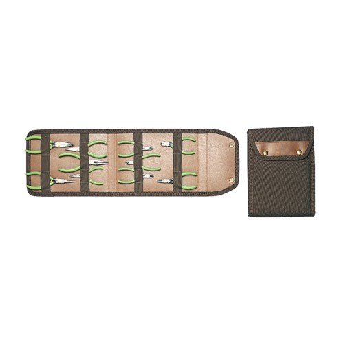 The Jensen Tools DKIT10 (117-736) is a 10-pc. electronic plier kit. A comprehensive assortment of precision tools organized and protected in a durable Cordura case. Kit contains five cutters and five pliers. Cutters include models MS54, MS54-9J, MS54-3J, GA54J, and EC54J. Pliers include models L4, SN55, NN55G, CN55G, and DN54G. Brown case has heavy-duty, wide elastic straps and a snap cover to securely hold pliers.