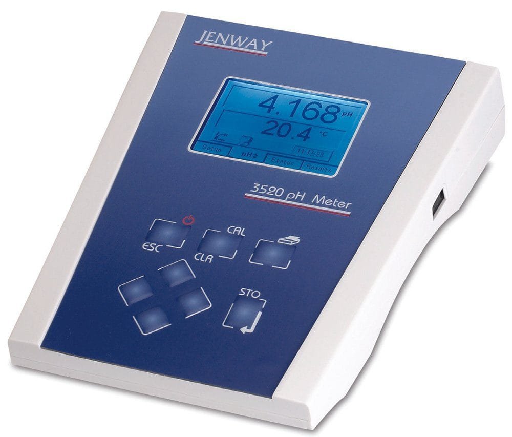 3520 pHmV meter supplied with glass combination pH electrode (924 005), electrode stand and holder, ATC probe (027 500), BNC shorting plug, pH 4, 7 and 10 buffer sachets 230v.