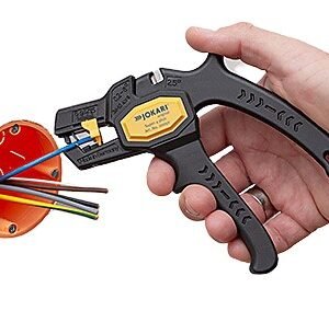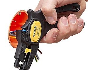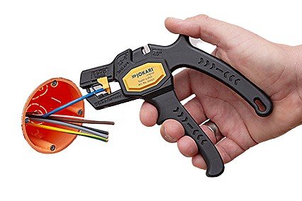 The Jokari 20050 is an ergonomic, automatic wire stripper for wires from 0.2 – 6.0 mm² (AWG 24 – 10). The wire cutter is perfect for diameters of up to 2.5 mm². It is used for speedy and precise stripping of wires even where access is difficult It has a plier-handle design with a lockable design. The length stopper is adjustable from 6 to 15 mm. TUV / GS approved.