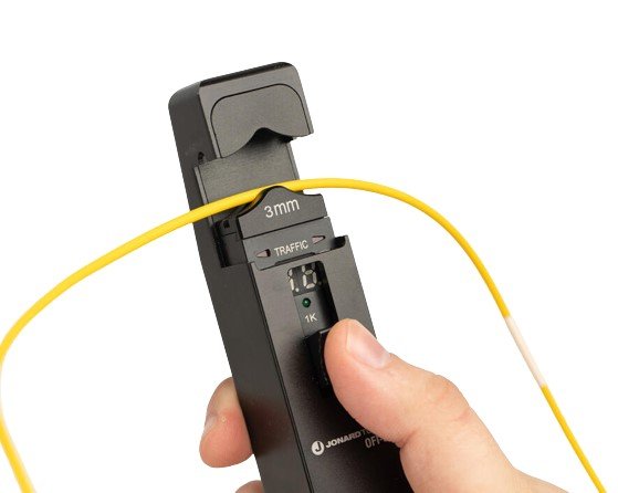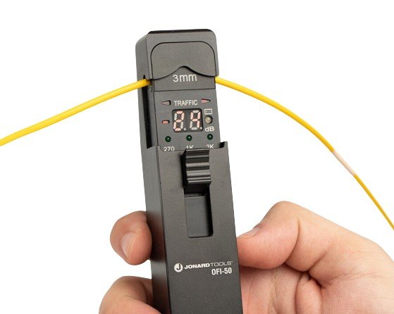 The Jonard OFI-50 Designed to quickly identify the direction of transmitted fiber and display the relative core power without damaging the fiber, this fiber identifier is the perfect tool for identifying fiber in network systems without disrupting the network.