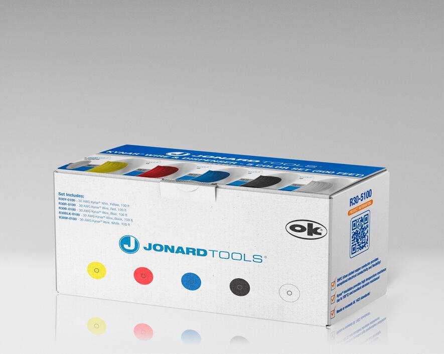 - This kit includes a dispenser box and five color spools of 30 AWG wire, each 100 feet long