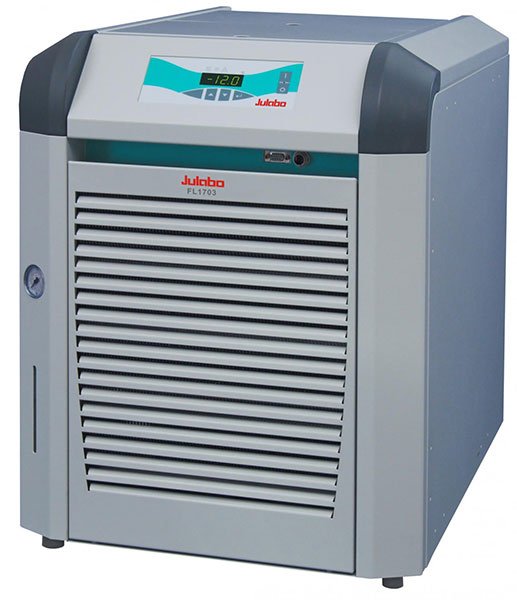 The FL series offers a new generation of chillers for routine cooling applications within the laboratory and industry. The temperature stability of the PID control is ±0.5°C. All units can easily be cleaned and are provided with a splash water proof keypad with LED temperature indication. On the front of the units there is an RS232 interface as well as an alarm shutdown. The filling port is easily accessible placed on the top under a lift-up cover. Another hinged tray serves as a file for the operating manual or other documents concerning the installation. The removable venting grid allows an easy cleaning of the condenser, the drain tap is easily accessible behind the grid. All models include an easily visible level indication. Another advantage is the venting slots are on the front and rear and therefore the units can be placed directly one beside the other (space saving).
