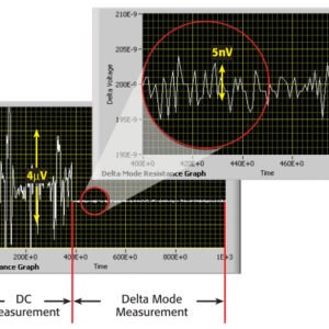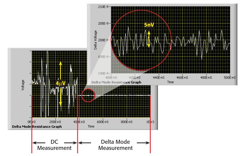 Keithley originally developed the delta mode method for making low noise measurements of voltages and resistances for use with the Model 2182 Nanovoltmeter and a triggerable external current source. Essentially, the delta mode automatically triggers the current source to alternate the signal polarity, then triggers a nanovoltmeter reading at each polarity. This current reversal technique cancels out any constant thermoelectric offsets, ensuring the results reflect the true value of the voltage.