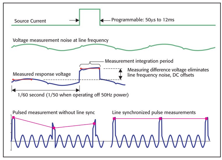 The Model 6221 makes short pulses (and reductions in heat dissipation) possible with microsecond rise times on all ranges. The Model 6221/2182A combination synchronizes the pulse and measurement. a measurement can begin as soon as 16µs after the Model 6221 applies the pulse. The entire pulse, including a complete nanovolt measurement, can be as short as 50µs. Line synchronization between the Model 6221 and Model 2182A eliminates power line related noise.