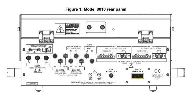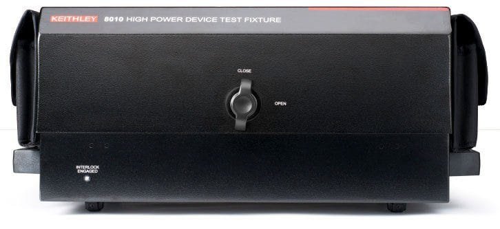 The Keithley 8010 High Power Device Test Fixture provides safe and easy connections for testing packaged high-power devices at up to 3000V or 100A. The Model 8010 provides connections for a high voltage SourceMeter instrument (Model 2657A), one or two high current SourceMeter instruments (Model 2651A), and three low power SourceMeter instruments (other Series 2600A or Model 4200-SCS source measurement unit (SMU) instruments). This allows devices with two terminals (diodes) or three terminals (transistors) or even four or five terminals to be characterized safely and accurately. The Model 8010 has full interlock capability for up to six SourceMeter instruments. The Model 8010 has integrated protection circuits that protect the low voltage SourceMeter instruments from high voltages the Model 2657A can output should a device fault occur. The Model 8010 includes both a high current (100A) and a high voltage (3000V) test socket. Various replacement test socket modules are available, including TO-247, TO-220, axial lead, and a blank socket module that allows the building a custom socket. In addition to standard banana jumpers, the Model 8010 has the rear-panel scope and thermal probe ports to simplify system integration.