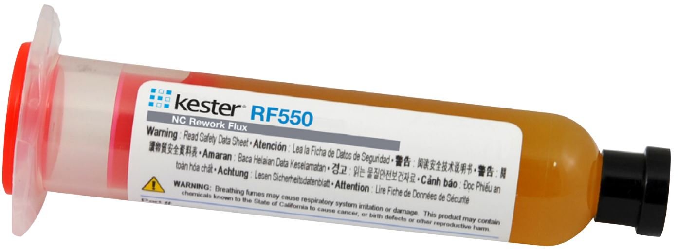 The Kester RF550 is a high-reliability, zero-halogen, no-clean rework flux designed for electronic component rework and repair applications. RF550 has a gel-like consistency and is packaged in syringes for easy dispensing. The RF550 can be precisely dispensed onto specific areas that require flux. After being dispensed, RF550 stays in place until soldering occurs.