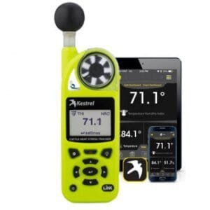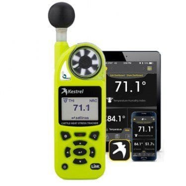The Kestrel 5400 Cattle Heat Stress Tracker offers micro-climate measurement and monitoring at the pen or yard location. Contains a built-in Globe Temperature sensor and complete cattle-specific calculations. Measure THI and HLI and track AHLU based on easy-to-input herd and pen parameters. Perform spot checks or mount in place with the included vane mount accessory to track AHLU for months. LiNK capability allows remote access to current and logged data from your iOS or Android mobile device. Mount a mobile data equipped tablet nearby to send mobile alerts even when you’re not on-site. Designed by Kestrel with input from some of the world’s most respected experts in cattle heat stress, the Kestrel 5400 Cattle Heat Stress Tracker is designed to help you MEASURE and MANAGE your herd’s heat stress, ensuring you MAXIMIZE your bottom line.