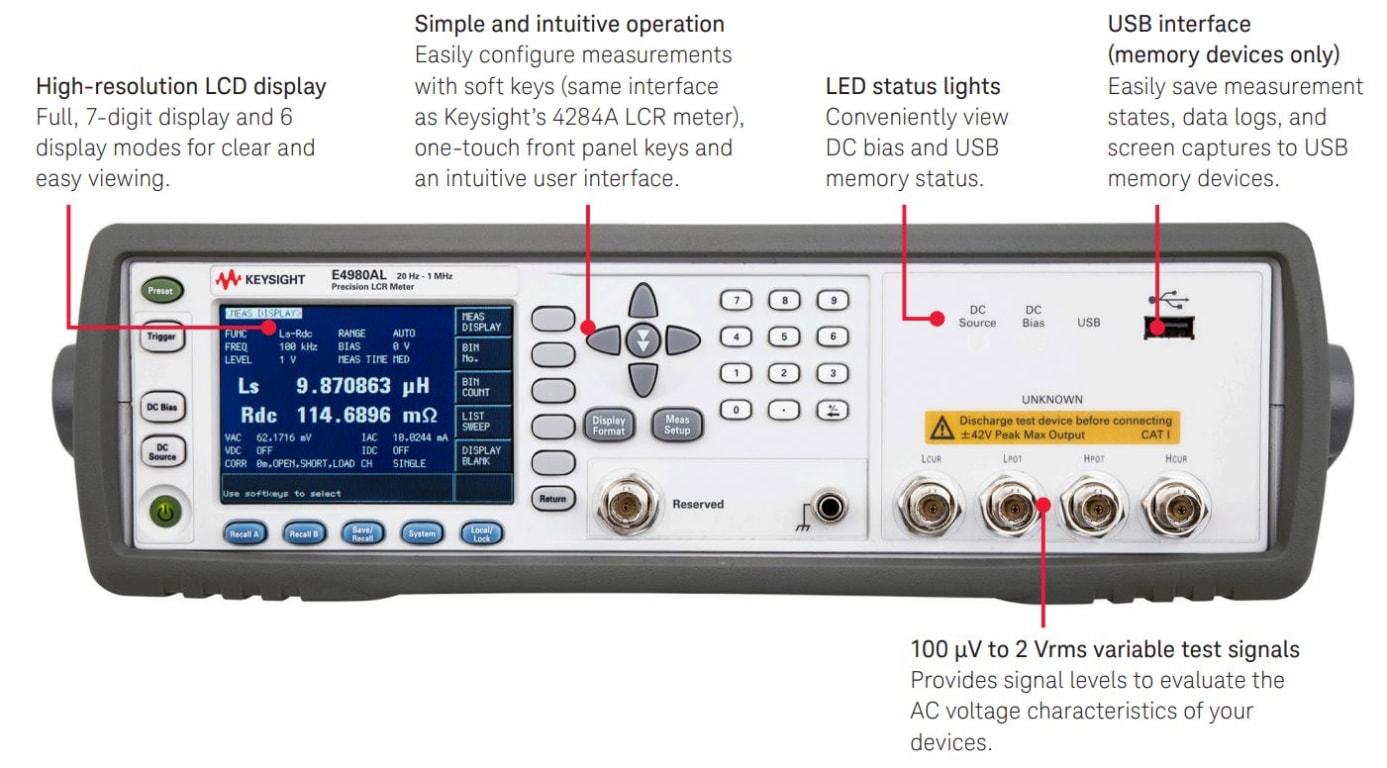 The E4980AL LCR meter offers excellent performance for all impedance measurements.