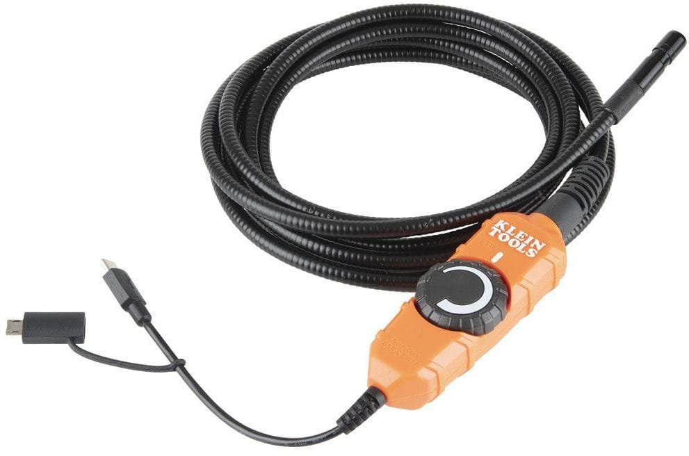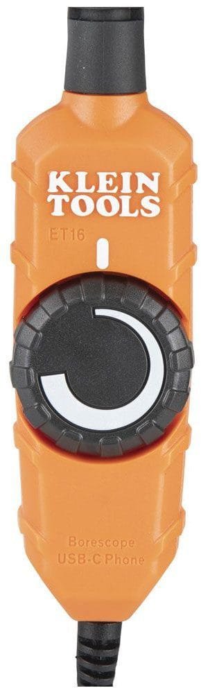 Klein Tools ET16 Borescope features a 9 mm camera surrounded by 6 LEDs attached to a 10-Foot (3 m) armored gooseneck cable. The digital camera has a USB Type-C (and micro-USB) connection for most Android® (OTG 4.0 or higher) smartphones and devices. The camera and video output is displayed on the Android® device using the free Klein Tools ET16 Borescope App, available for download at www.KleinTools.com (not available anywhere else). The ET16 does not require batteries; it is powered by device connection.