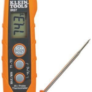 The Klein Tools IR07 is a dual IR (infrared) thermometer and probe thermometer. This rugged pocket thermometer measures temperature from -40 to 572-Degrees Fahrenheit (-40 to 300-Degrees Celsius) for both IR and probe measurements. The IR thermometer has a Distance-to-Spot ratio of 8:1 and the target laser can also be used as a laser pointer. The Probe accurately measures air, liquid, and surface temps and has a convenient hook for hands-free indoor measurements. The IR07 quickly calculates differential temperature (T1-T2) and has a backlit LCD for easy viewing in low light.