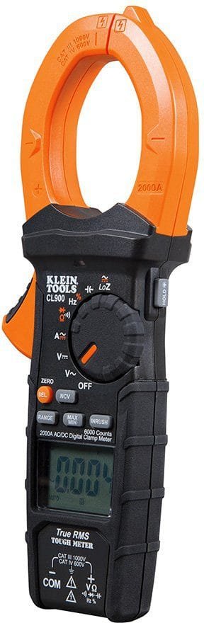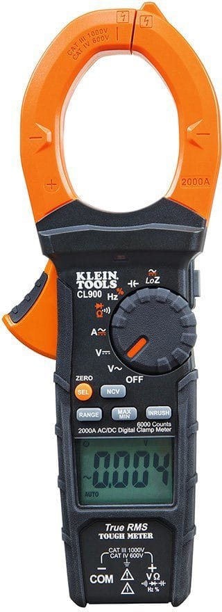 The CL900 is an auto-ranging, true root mean square (TRMS) digital clamp meter that measures AC/DC current via the clamp and measures AC/DC voltage, resistance, continuity, frequency, duty-cycle, capacitance, and tests diodes via test-leads. It features a Low Impedance (LoZ) mode for identifying and eliminating ghost or stray voltages, and has a dedicated mode for capturing Inrush Current.