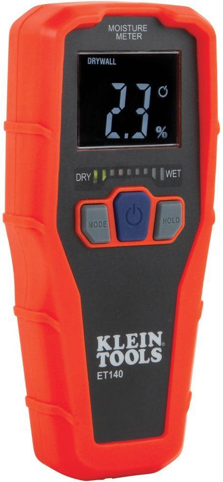 Klein Tools ET140 Moisture Meter is designed to non-invasively detect hidden moisture content up to 3/4-Inch (19 mm) depth. Easily select between materials with the mode button to test the surface of drywall, masonry, hardwood, and softwood. The ET140 has easy viewing with bright, reverse-contrast display and LED bar graph.