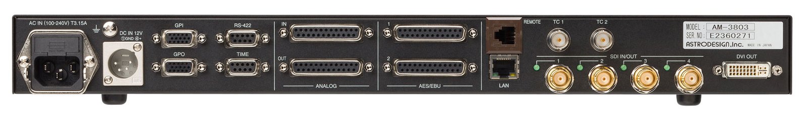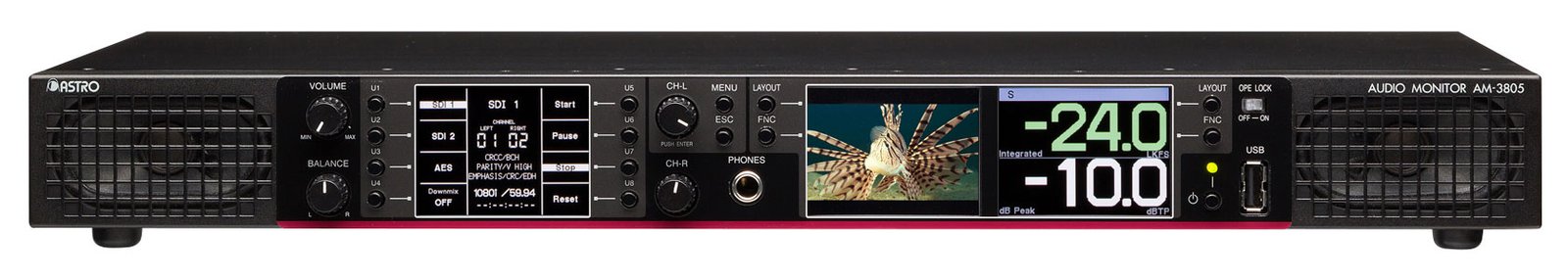 Astro audio monitor AM-3805 separates audio signal embedded in HD/SD-SDI and output to equipped speakers and headphones for audio monitoring. It supports wide variety of display mode such as VU, Peak, Lissajous, Spectrum and Loudness meter.