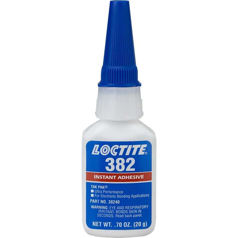 The Loctite 382 is a transparent, colorless, general-purpose, instant adhesive gel with a fixture time of 20 – 40 secs.