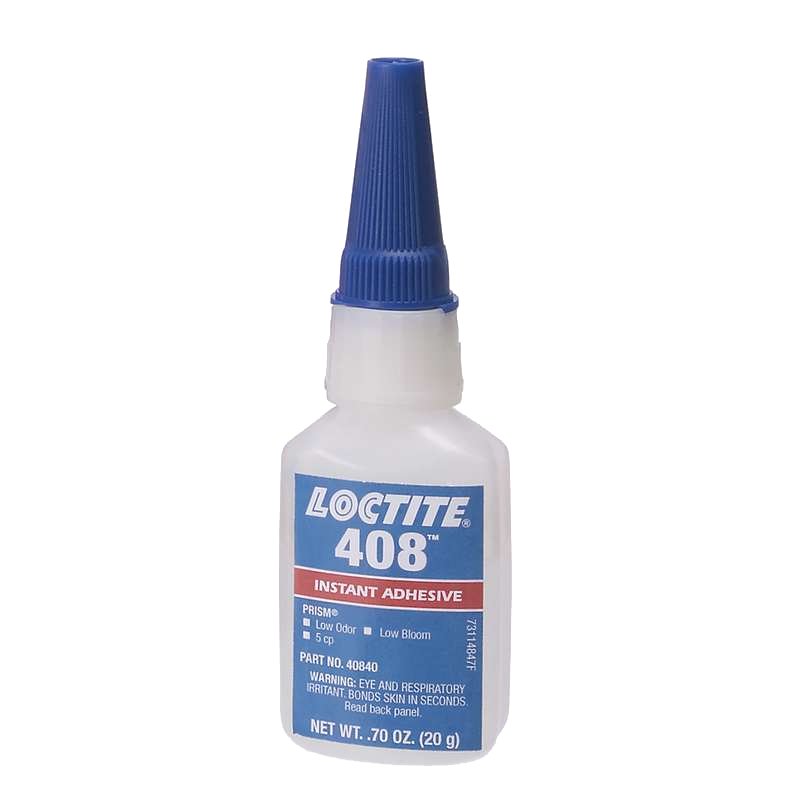 The Loctite 408 is a transparent, colorless, low odor, low bloom, alkoxy ethyl-based instant adhesive (cyanoacrylate) which cures very quickly when confined between two close-fitting surfaces. It is suitable for plastics and polyolefins in combination with Primer Loctite SF 770 or Loctite SF 7239 and ideal for metal, rubber, and is well suited for porous and/or acidic surfaces.