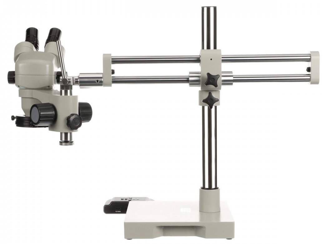 The dual arm roller bearing stand has a 17.5″ vertical and 22″ horizontal reach. It is extremely stable, coming in at 61 pounds and having a 10″x10″ base. Its focus mount angles to 45° to permit additional viewing and inspection perspectives.