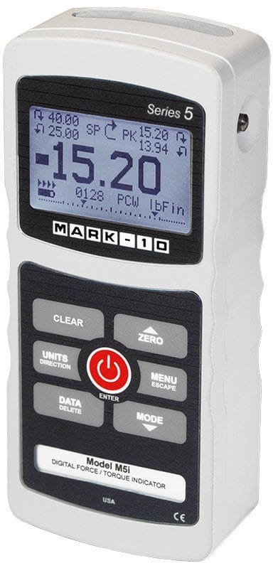 The 5i advanced digital force / torque indicator is designed to work with a wide range of Mark-10 remote force and torque sensors. With exclusive Plug & TestTM technology, all calibration and configuration data is saved within the sensor’s smart connector, not the indicator, allowing for true interchangeability. Sensor password protection prevents use of an unauthorized sensor. In addition, all sensors are fully compatible with the more basic 3i force / torque indicator.
