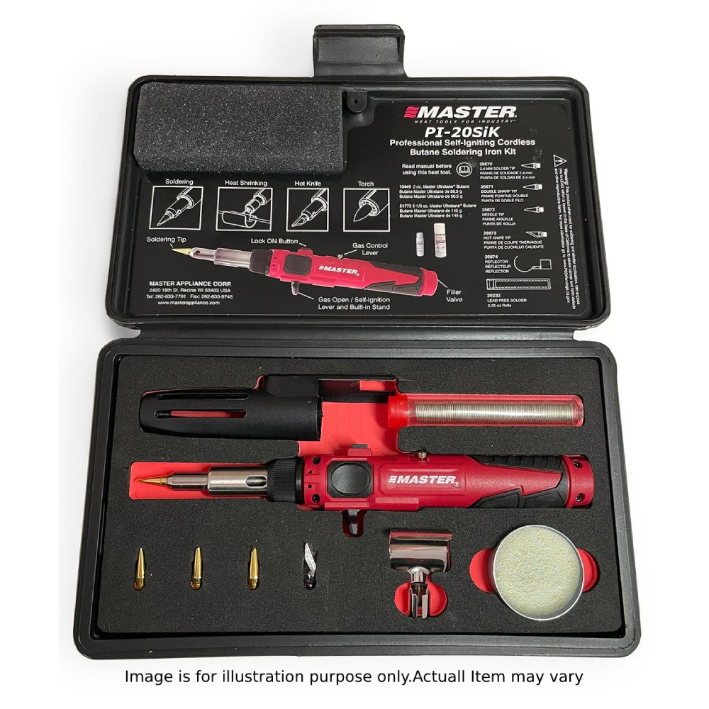 The Master Appliences PI-20SIK is a Professional Soldering Iron Kit with 4 Soldering tips: 2.4mm solder tip, double sharp tip, needle tip, hot knife tip.