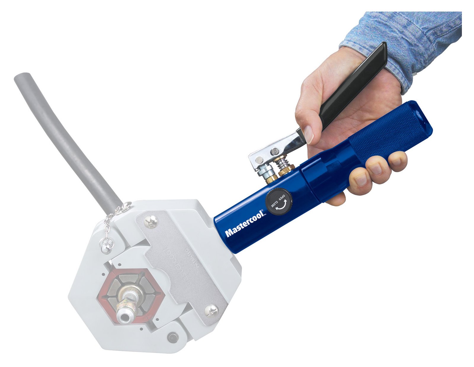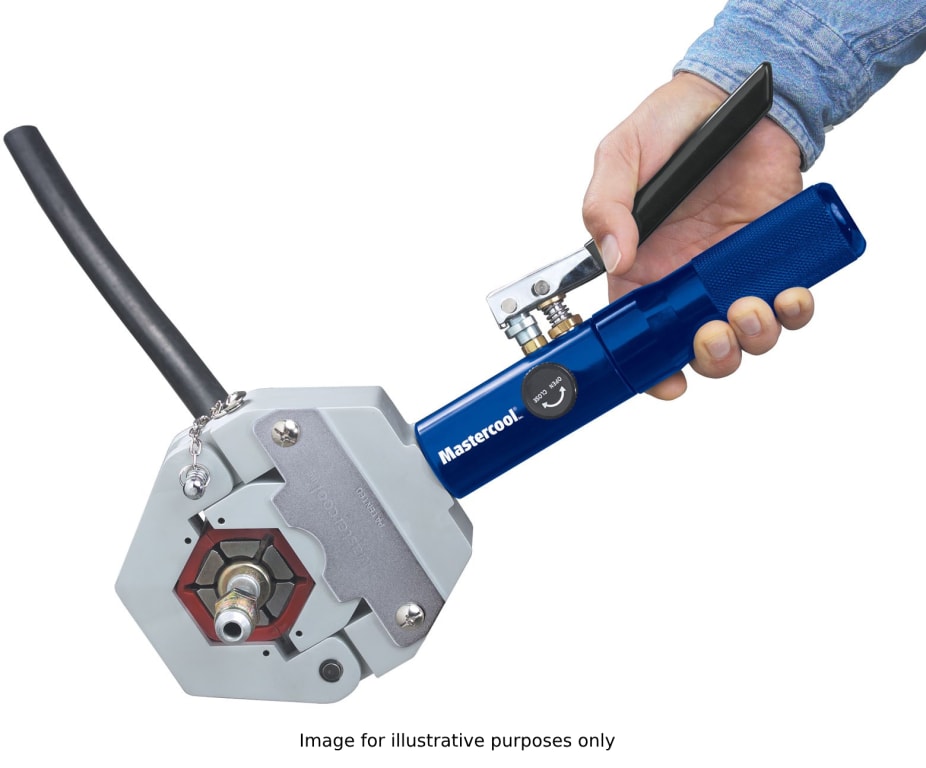 Mastercool’s patented “Hydra Krimp” makes crimping barbed and beaded fittings as easy. The lightweight hand-held hydraulic press is very portable and ideal for shop and field applications.