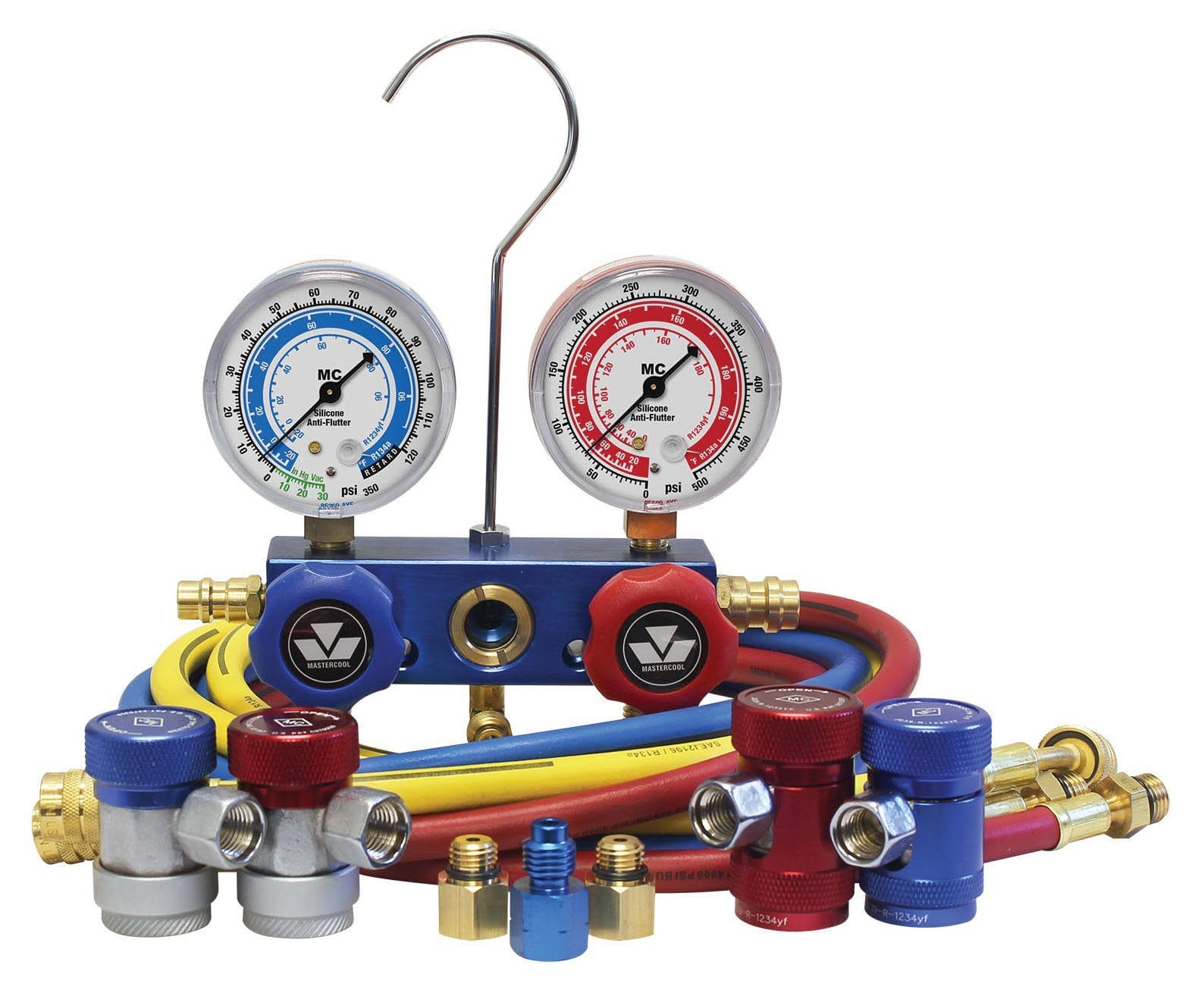 R1234yf/R134a aluminum manifold gauge set, 2 1/2″ gauges, 3-72″ R134a standard hoses, R134a manual couplers (82834, 82934), R1234yf couplers (83834, 83934), 1/2″ acme-m x 1/2″ acme-f LH thread adapter (83633), (2) 12 mm-m x 14 mm-f R1234yf adapters (83735).