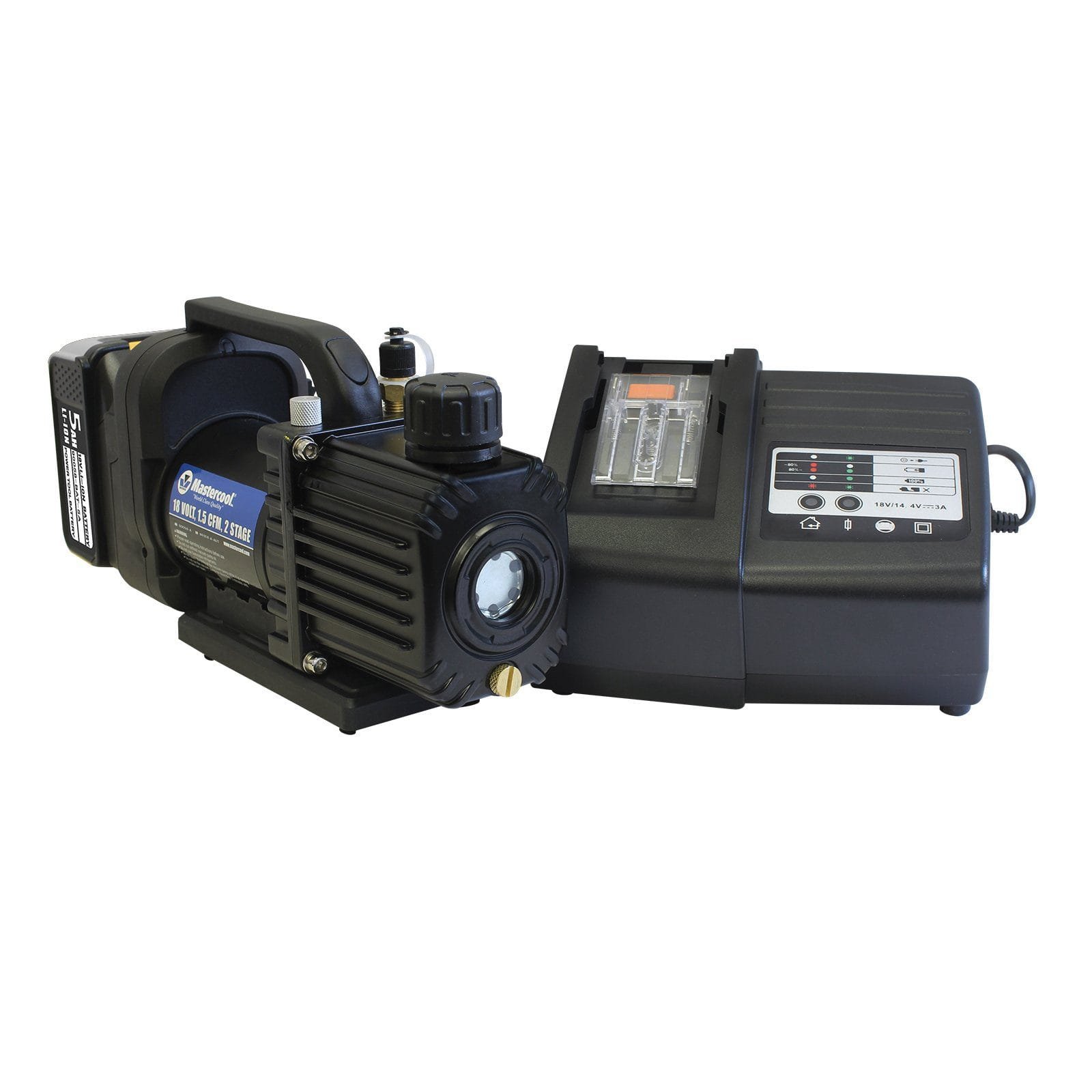 This cordless Mastercool vacuum pump features a 1.5 CFM free air displacement and runs off a rechargeable 18V battery.