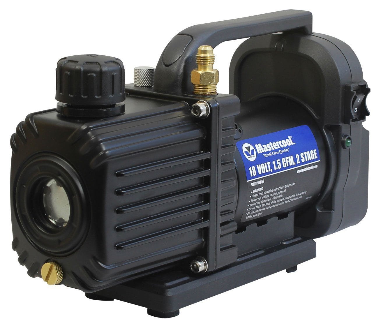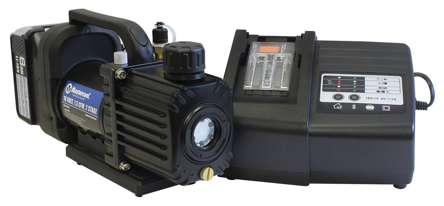 The Mastercool 90058 is a two stage, 1.5 CFM vacuum pump that is battery operated. Unlike most vacuum pumps, the 90058 runs on an 18v/6Ah rechargeable battery and does not run on a line cord. This lightweight pump weighs only 7.9 pounds and has an ultimate vacuum of 15 microns.