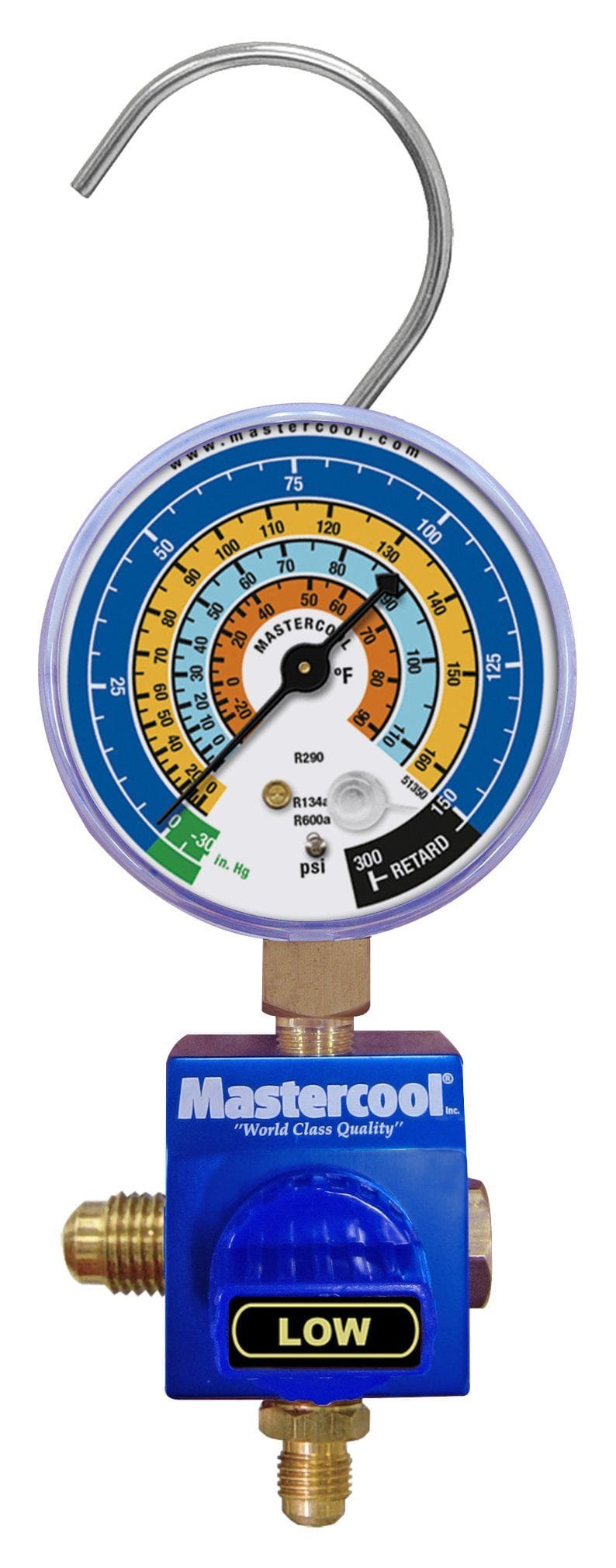 Mastercool 92103-53-1/4 – R600a, R290, R134a Aluminum 1/4-inch Single Ball Valve Manifold with 3-1/8″ Gauge