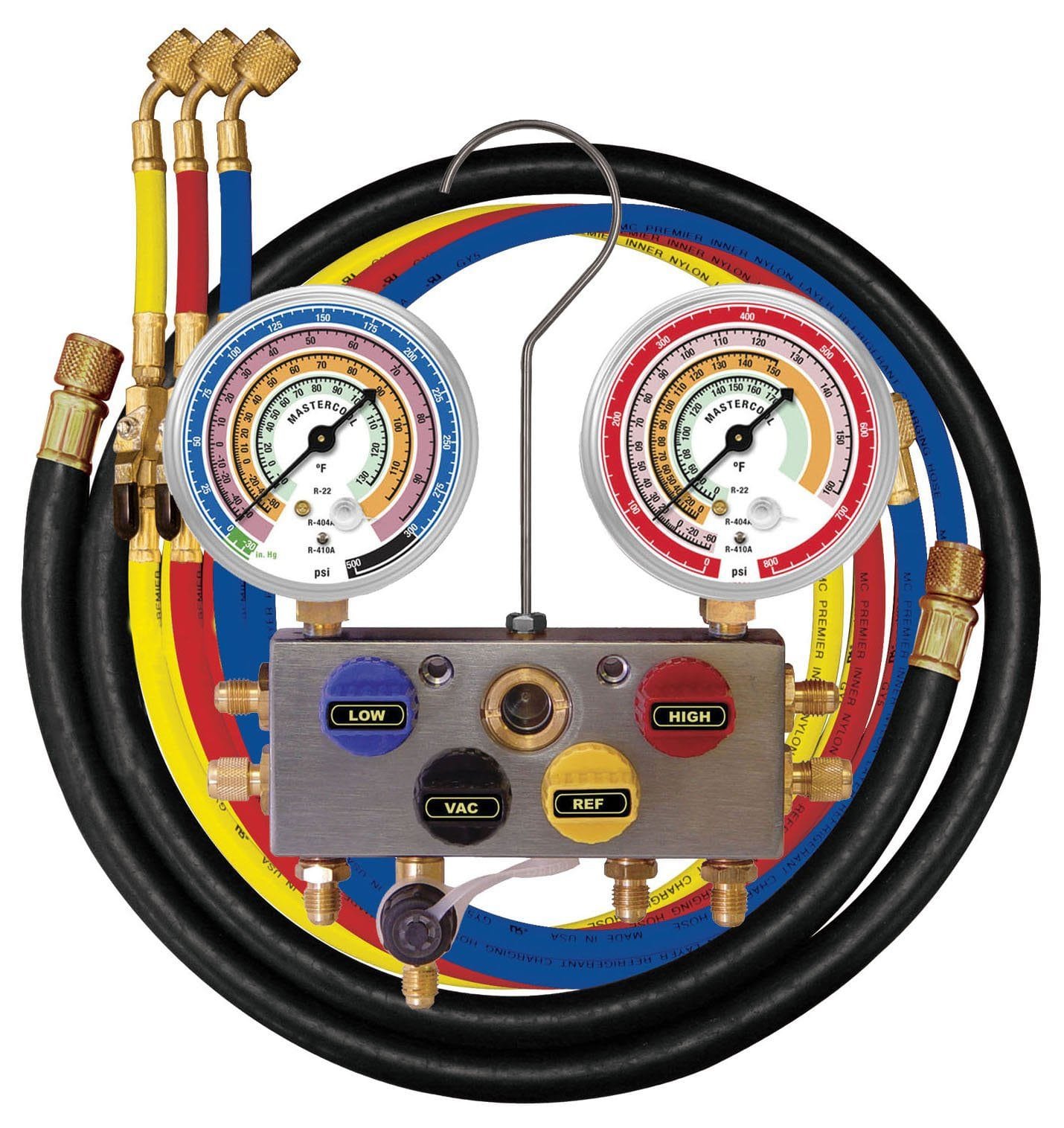 R410A, R22, R404A 4-Way Aluminum Manifold gauge set includes set of 60″ hoses (1/4″ SAE blue, red and yellow nylon barrier ball valve hoses with manual shut-off valves) and one 3/8″ SAE black vacuum hose packaged in a blow molded case.