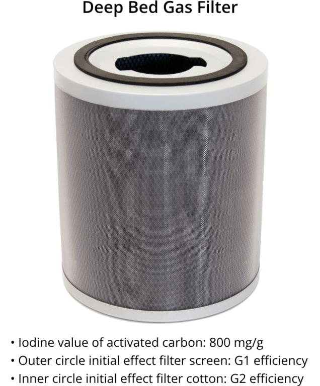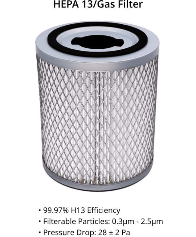 - Replacement main filter (HEPA 13/Carbon, 99.97%)
